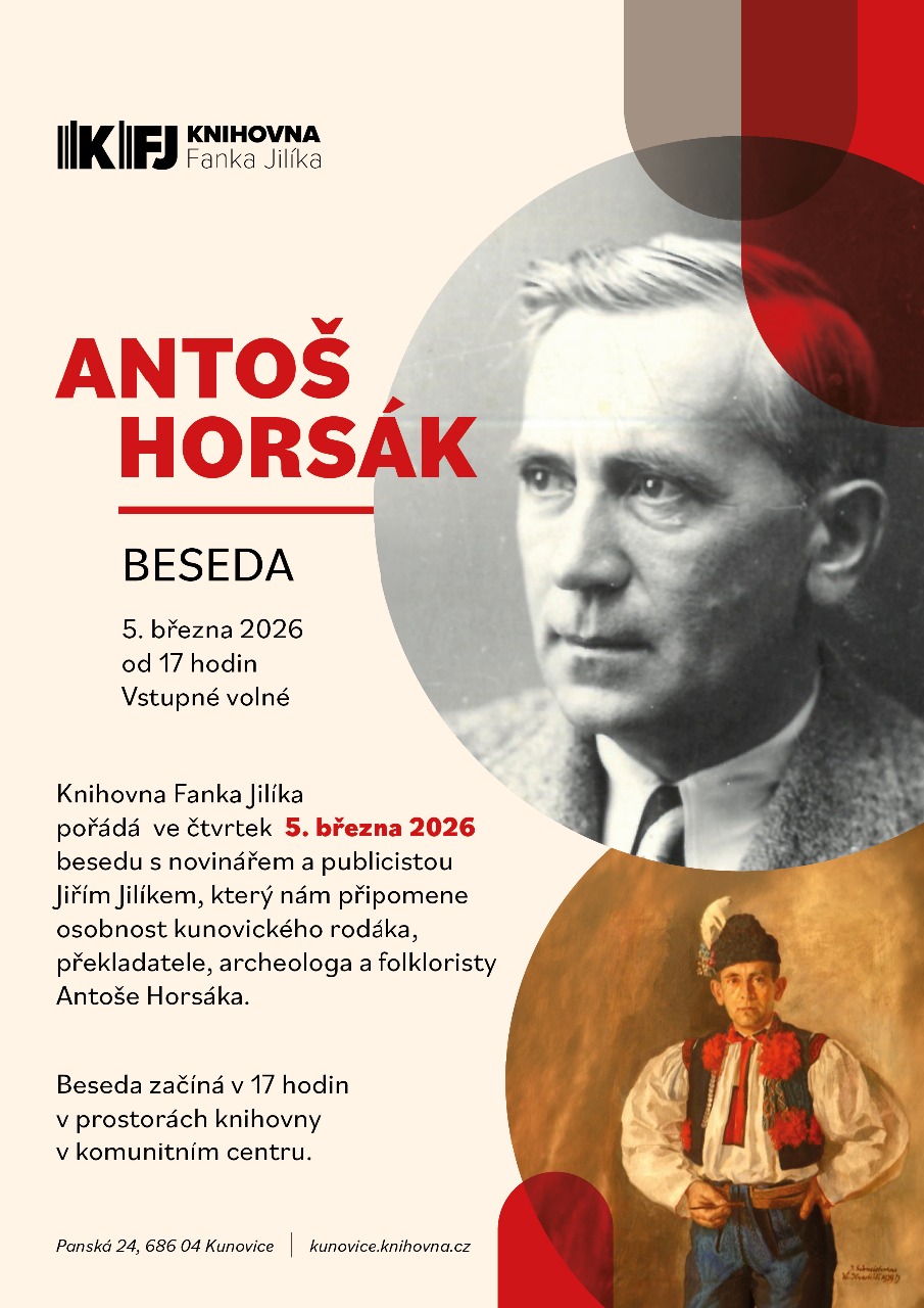 Zveme vás na besedu s novinářem a publicistou Jiřím Jilíkem o Antoši Horsákovi, významné osobnosti Kunovic. Koná se ve čtvrtek 5. března 2026 v 17:00 v prostorách knihovny.
